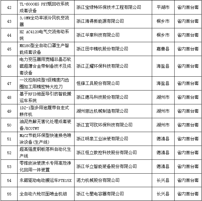2018年度浙江省裝備制造業(yè)重點(diǎn)領(lǐng)域首臺(tái)(套)產(chǎn)品認(rèn)定結(jié)果公示名單